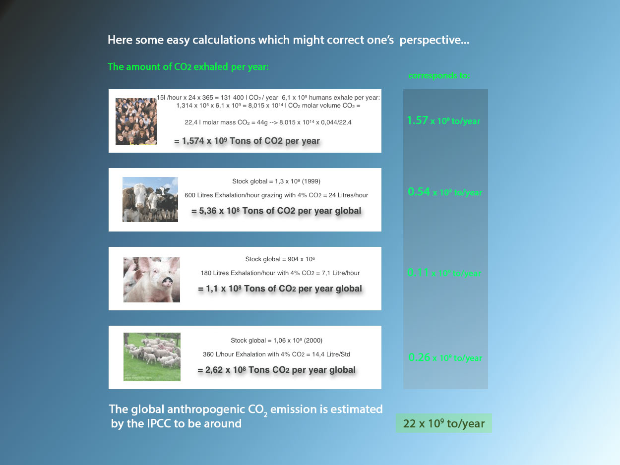 Just one aphid culture amounts to >1019 animals in a season! The billions of mammals including humans are comparably negligible. On corresponding entomological (the scientific study of insects) web sites one can find test results for insects of the most important types undertaken with a spirometer. Spirometry (meaning the measuring of breath), allows reproducible measurements of the CO2-emission of living organisms. Exhalation of CO2 depends among other things on the age, the nourishment, the state of health, the climate and the current activity (achievement revenue) of the test object.
