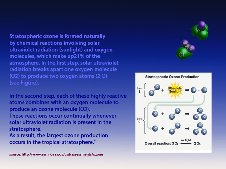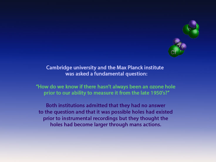 Until recently it was also the consensus science advocating that the progressive change in the ozone layer was caused by humans. The general doctrine: CFC, allegedly exclusively deriving from human industrial production, destroyed the ozone layer by means of chlorine elimination. This statement was even honoured in 1995 with a Nobel Prize and consequently all technical production of CFCs was banned worldwide.