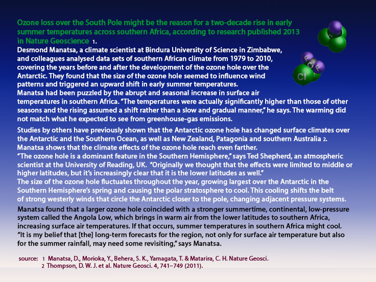 The ozone hole over the Antarctic, contrary to expectations, did not shrink in recent times, but was in the years 2006 to 2008 at times even greater than in the 1990's. New scientific evidence suggests that the long-time used theories about the causes of Ozone layer destruction were totally incomplete and may be only slightly relevant. Therefore one of the few environmental success stories of banning CFS was shaken to the ground. The natural ozone layer of our planet is protecting life on earth from aggressive, ultraviolet radiation of the sun. Ozone, a variant of the tri-atomic oxygen, has the effect that 'hard' radiation, high-energy electromagnetic radiation, is prevented from penetrating freely to the surface already in the lower stratosphere. A reduction of the natural ozone in 10 to 30