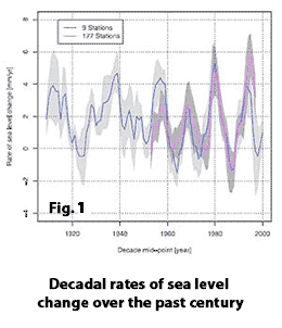 Figure 1 (left) shows decadal rates of sea level change over the past century. All rates are corrected for glacial isostatic adjustment and inverse barometer effects. The shaded region indicates +/- 1